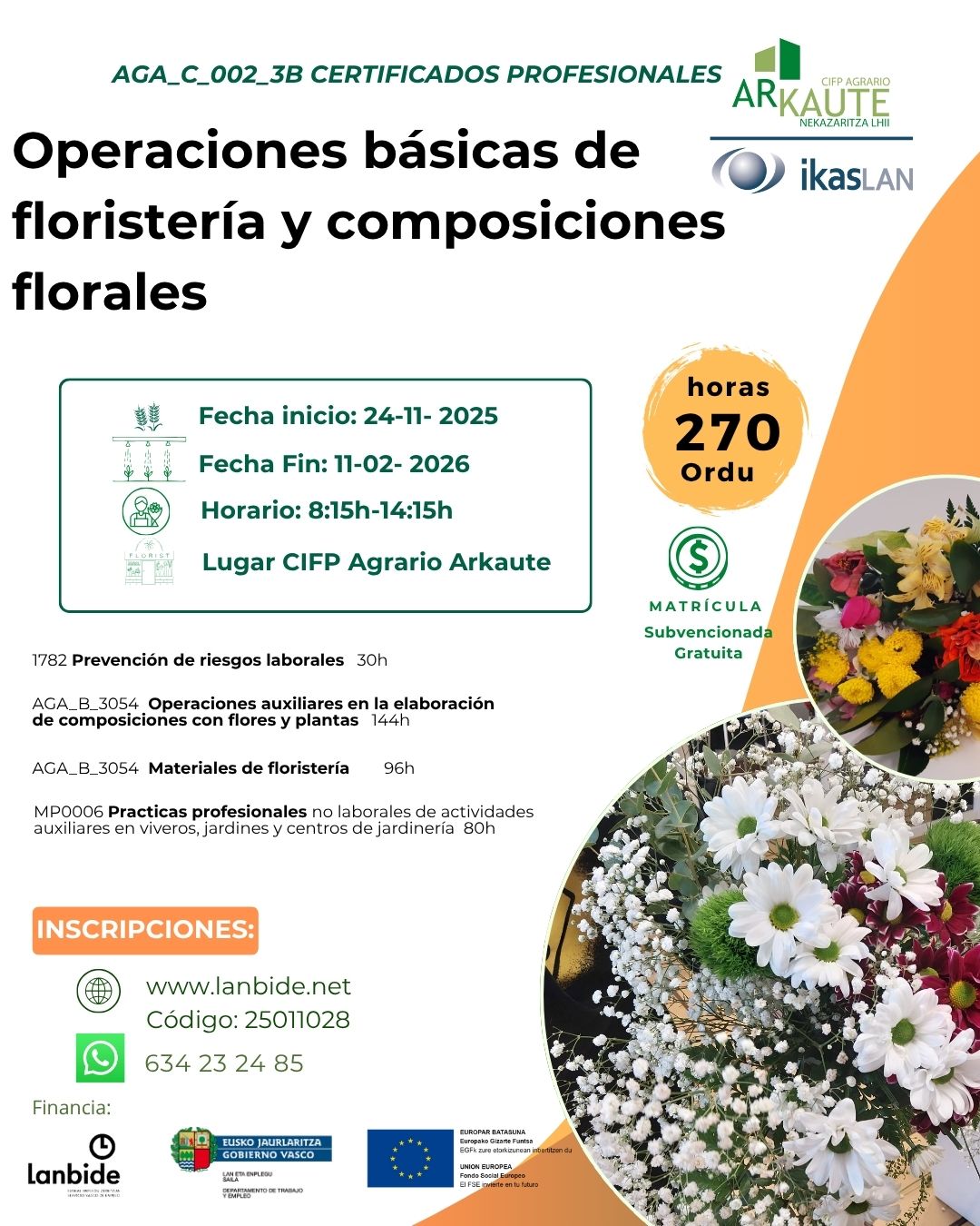 2.mailako Ziurtagiri Profesionala Elaboración de composiciones florales y técnicas de venta en establecimientos de floristeria 2026ko martxotik maiatzararte Izen ematea www.lanbide.net 25011029 kodea