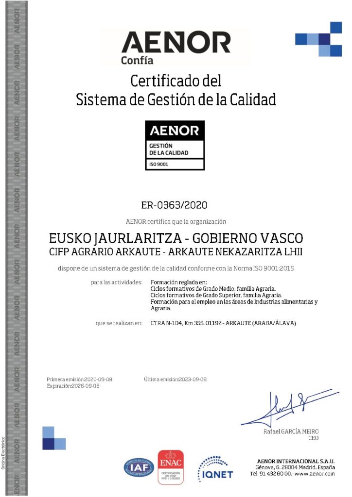 EL CIFP Agrario Arkaute entiende la calidad como parte fundamental de su filosofía y de su estrategia. Por ello se responsabiliza y adquiere el compromiso de establecer, desarrollar y mejorar continuamente un sistema de Calidad basado en la norma UNE-EN ISO 9001:2015, con el fin de conseguir su objetivo fundamental: